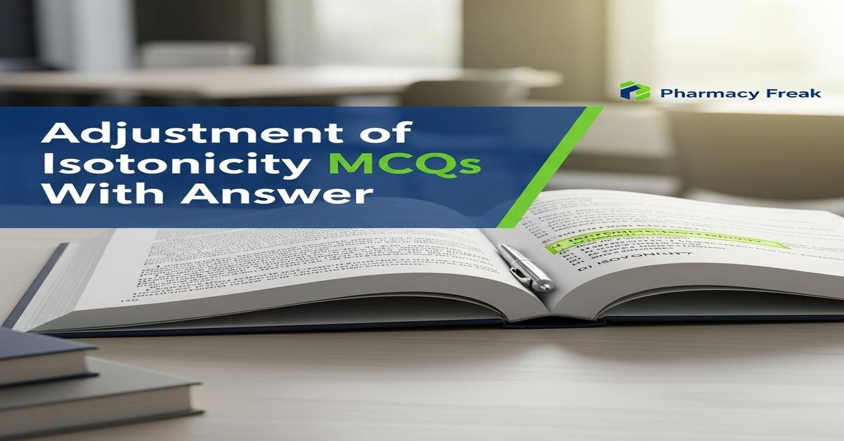 Adjustment of isotonicity MCQs With Answer helps B. Pharm students master how to make ophthalmic, parenteral, and nasal formulations physiologically compatible. Understanding tonicity vs osmolarity, freezing point depression (cryoscopic method), sodium chloride equivalent (E-value), and White–Vincent/Sprowls methods is essential in pharmaceutics. Topics include 0.9% NaCl standards, -0.52°C isotonic freezing point, colligative properties, effects of hypertonic/hypotonic solutions (crenation, hemolysis), and choosing adjusters like NaCl, dextrose, mannitol, or boric acid (ophthalmics). You’ll also learn calculation shortcuts (0.009 × V − ΣwE), clinical tolerances (ophthalmic 0.6–2% NaCl equivalent), and pitfalls with penetrating solutes (urea, glycerol). Now let’s test your knowledge with 50 MCQs on this topic.