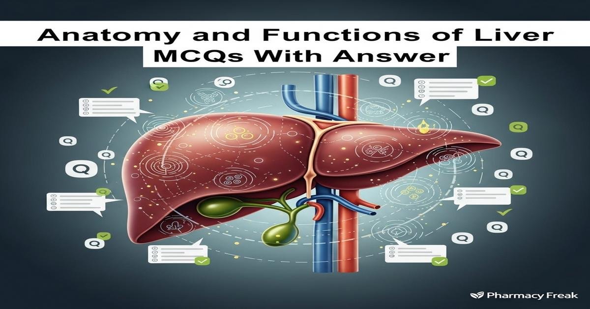 Anatomy and functions of liver MCQs With Answer — This concise, student-focused introduction explains liver anatomy, microanatomy and core hepatic functions relevant to B. Pharm studies. It covers lobar and segmental anatomy, blood supply, hepatic sinusoids, hepatocytes, Kupffer and stellate cells, bile formation, metabolism of drugs, first-pass effect, protein synthesis, detoxification and clinical correlations like cirrhosis and drug-induced liver injury. Keywords such as liver anatomy, liver functions, hepatic metabolism, drug metabolism, and B. Pharm are integrated to support SEO and exam preparation. Clear, practical emphasis helps pharmacy students link structure to pharmacokinetics and therapeutics. Now let’s test your knowledge with 50 MCQs on this topic.