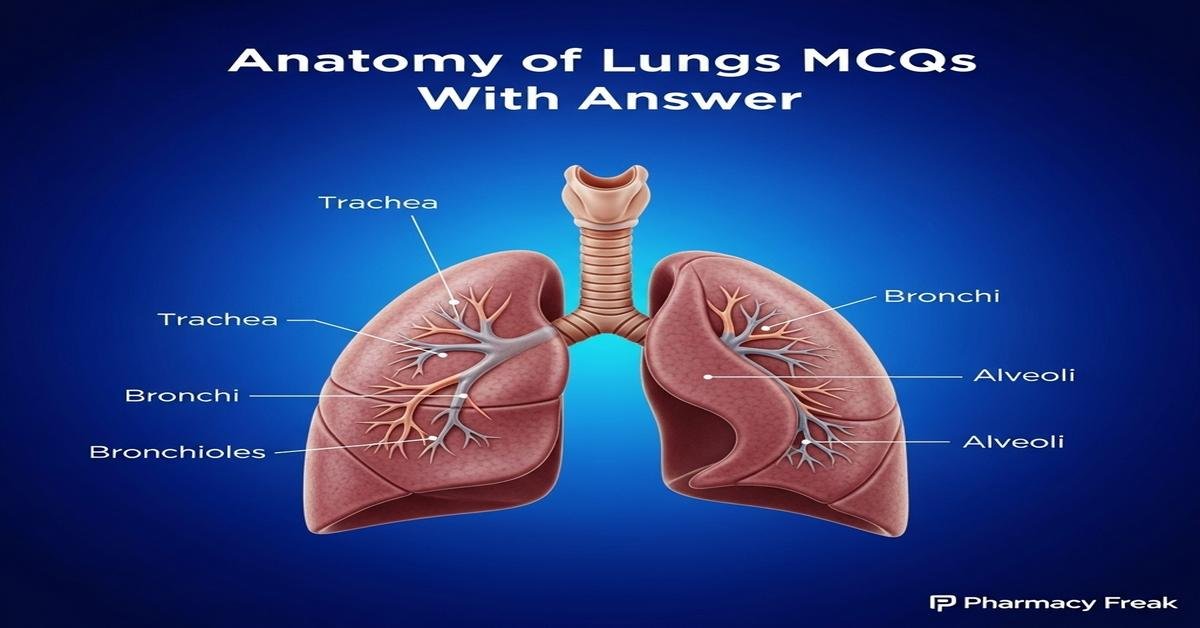 Mastering the Anatomy of Lungs MCQs With Answer is essential for B. Pharm students preparing for pharmacology, physiology and clinical exams. This focused guide covers lung structure — including trachea, bronchi, bronchioles, alveoli, pleura and pulmonary vasculature — and highlights functional aspects like gas exchange, ventilation and defense mechanisms. Clear, exam-oriented explanations and targeted keywords help improve recall and search visibility. Practicing MCQs strengthens understanding of respiratory pharmacotherapy, drug delivery and pathophysiology relevant to pharmacy practice. Use these practice questions to solidify concepts and identify weak areas before practicals and assessments. Now let’s test your knowledge with 50 MCQs on this topic.