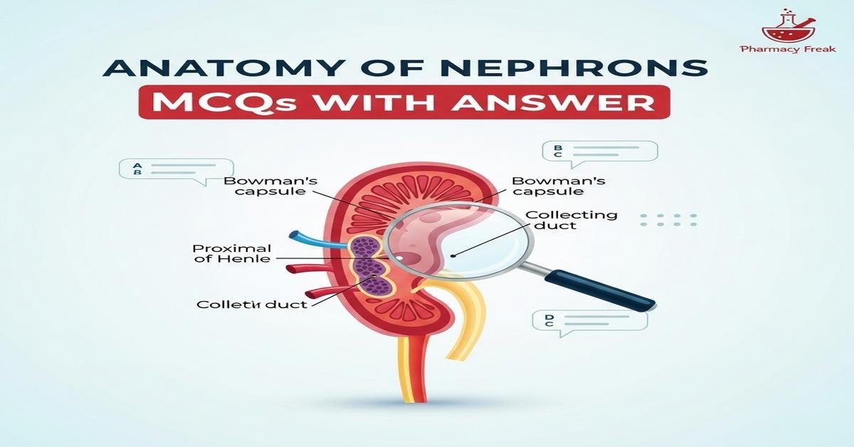 Anatomy of nephrons MCQs With Answer is a concise, keyword-rich introduction for B. Pharm students focusing on nephron anatomy, structure, and renal microanatomy. This resource covers glomerulus, Bowman’s capsule, proximal tubule, loop of Henle, distal convoluted tubule, collecting duct, juxtaglomerular apparatus, podocytes, mesangial cells, vasa recta, and filtration barriers with clear emphasis on functional relevance for drug action and renal physiology. Ideal for exam preparation and concept reinforcement, these MCQs with answers help strengthen understanding of filtration, reabsorption, secretion, countercurrent mechanisms, and transporter physiology. Now let’s test your knowledge with 50 MCQs on this topic.