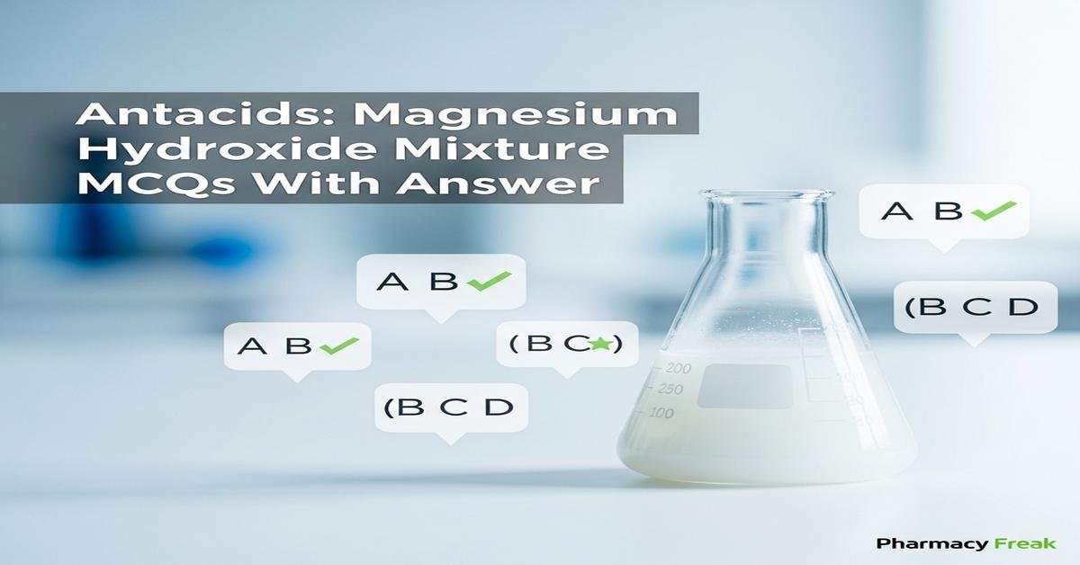 Antacids: Magnesium hydroxide mixture MCQs With Answer provides B. Pharm students a focused review of magnesium hydroxide as a liquid antacid—covering chemistry, mechanism, formulation, dosing, quality control, drug interactions and adverse effects. This concise, keyword-rich introduction emphasizes terms like antacids, magnesium hydroxide mixture, acid neutralizing capacity (ANC), formulation stability, hypermagnesemia, drug interactions and compounding considerations. Designed for exam preparation and practical pharmacy practice, the content balances pharmacology, pharmaceutics and regulatory testing to deepen understanding. Clear, clinical and formulation-focused questions help reinforce critical concepts required in B. Pharm courses. Now let’s test your knowledge with 50 MCQs on this topic.