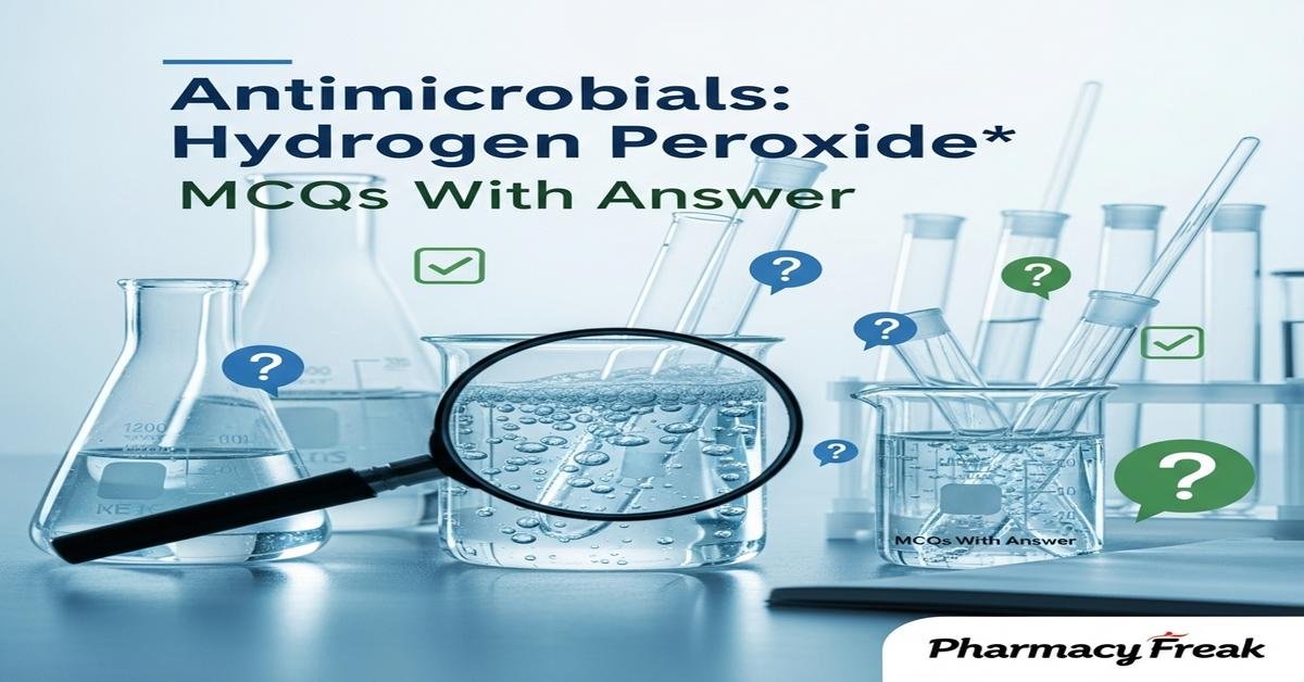 Hydrogen peroxide is a versatile antimicrobial and oxidizing agent widely covered in B.Pharm curricula. This introduction explains key concepts including mechanism of action (generation of reactive oxygen species), spectrum of activity (bactericidal, fungicidal, virucidal; limited sporicidal effect), concentration-dependent uses (3% antiseptic, 30% industrial, vaporized H2O2 for sterilization), stabilization and incompatibilities, assay methods, and safety handling. Understanding catalase/peroxidase interactions, formulation stabilizers, decomposition kinetics, and clinical versus industrial applications is essential for pharmacists in practice and research. These MCQs will help reinforce mechanistic and practical knowledge for exam preparation and professional competence. ‘Now let’s test your knowledge with 50 MCQs on this topic.’