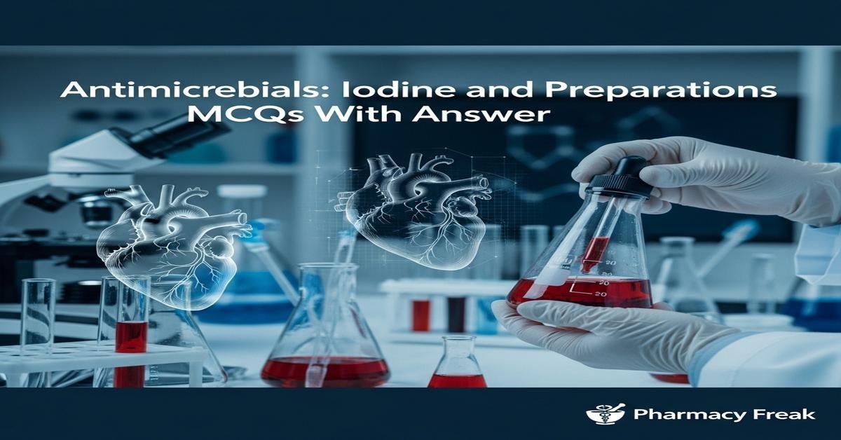 Introduction: Antimicrobials: Iodine and Preparations MCQs With Answer is a focused study aid for B. Pharm students covering iodine chemistry, iodophors (like povidone‑iodine), tinctures, mechanisms of action, formulations, stability, assays, clinical uses, safety and resistance. This Student-friendly guide highlights key keywords — iodine, povidone-iodine, iodophors, antiseptics, antimicrobial agents, formulations, mechanism of action, and B. Pharm MCQs — to help deepen understanding and improve exam readiness. Questions range from basic concepts to formulation specifics, pharmacology and quality control considerations relevant to pharmacy practice. Now let’s test your knowledge with 50 MCQs on this topic.