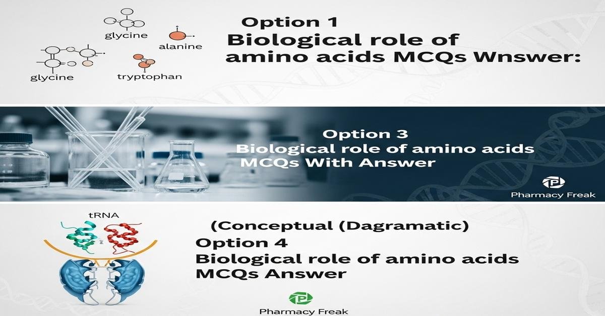 Understanding the biological role of amino acids is essential for B. Pharm students preparing for pharmacology, biochemistry, and therapeutics. This SEO-focused guide on Biological role of amino acids MCQs With Answer explains how amino acids act as protein building blocks, neurotransmitter precursors, metabolic intermediates, and regulators of drug metabolism. Topics covered include essential versus non-essential amino acids, nitrogen balance, urea cycle, gluconeogenesis, ketogenesis, post-translational modifications, and clinical correlations relevant to pharmacy practice. Each question emphasizes mechanism, pathway, and therapeutic relevance to deepen conceptual understanding and exam readiness. Now let’s test your knowledge with 50 MCQs on this topic.