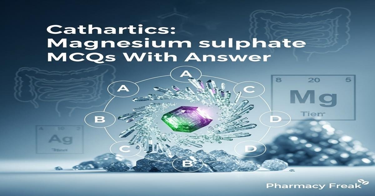 Magnesium sulphate is an important osmotic cathartic frequently covered in B. Pharm pharmacology and therapeutics modules. This introduction explains its mechanism of action, therapeutic uses as a saline laxative and bowel prep, typical oral doses and onset, adverse effects like hypermagnesemia and dehydration, contraindications such as renal failure and intestinal obstruction, and key drug interactions. These concise, keyword-rich points help students understand pharmacodynamics, pharmacokinetics, monitoring and patient counseling. Ideal for revision before exams or practicals, this set focuses on clinical and pharmaceutical aspects relevant to coursework and pharmacy practice. Now let’s test your knowledge with 50 MCQs on this topic.