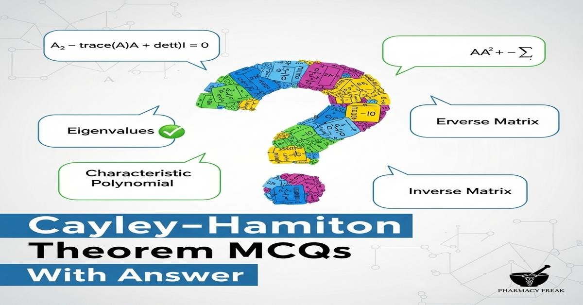 Introduction: Mastering the Cayley–Hamilton theorem is essential for B. Pharm students studying linear algebra applications in pharmacokinetics, compartmental modeling, and drug distribution analysis. This collection of Cayley–Hamilton theorem MCQs With Answer focuses on core ideas—characteristic polynomial, matrix powers, minimal polynomial, and matrix exponential—using pharmacy-relevant examples and clear, exam-oriented practice. Questions go deeper than definitions, covering verification of the theorem on small matrices, techniques to compute A^n, implications for diagonalizable and Jordan-block matrices, and applications to linear ODE systems used in compartment models. Strengthen your analytical skills and problem-solving confidence for coursework and exams. Now let’s test your knowledge with 50 MCQs on this topic.