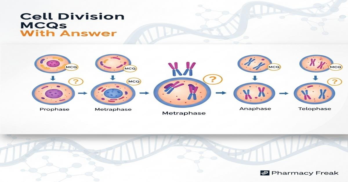 Cell division MCQs With Answer designed for B.Pharm students provide a focused, exam-ready review of mitosis, meiosis, cytokinesis, and cell cycle regulation. This concise, high-yield introduction covers key concepts such as phases of the cell cycle, cyclins and CDKs, checkpoints, chromosome behavior, and mechanisms of DNA replication and repair. Emphasis on pharmacological implications—anticancer drugs, mitotic inhibitors, and molecular targets—helps bridge theory and therapeutics. Each question includes detailed options and is tailored to strengthen conceptual clarity and application. Now let’s test your knowledge with 50 MCQs on this topic.