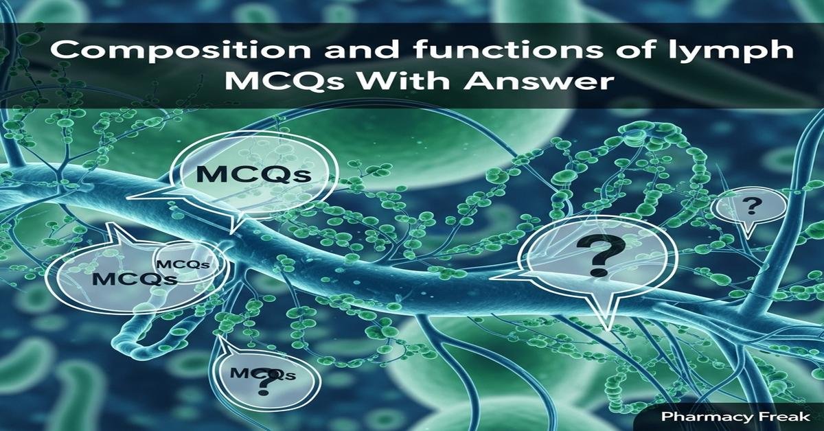 Composition and functions of lymph MCQs With Answer is a focused study guide tailored for B. Pharm students exploring the lymphatic system’s biochemical makeup and physiological roles. This introduction covers lymph composition—cells (lymphocytes, macrophages), proteins, lipids (chyle), electrolytes—and core functions such as immune surveillance, transport of dietary lipids, fluid homeostasis, and drug/antigen trafficking. Emphasis is placed on clinical and pharmaceutical relevance: lymph formation, thoracic duct anatomy, lymph node filtering, and implications for lymphatic drug delivery and vaccines. Clear, concise terminology and targeted keywords help reinforce learning and exam preparation. Now let’s test your knowledge with 50 MCQs on this topic.