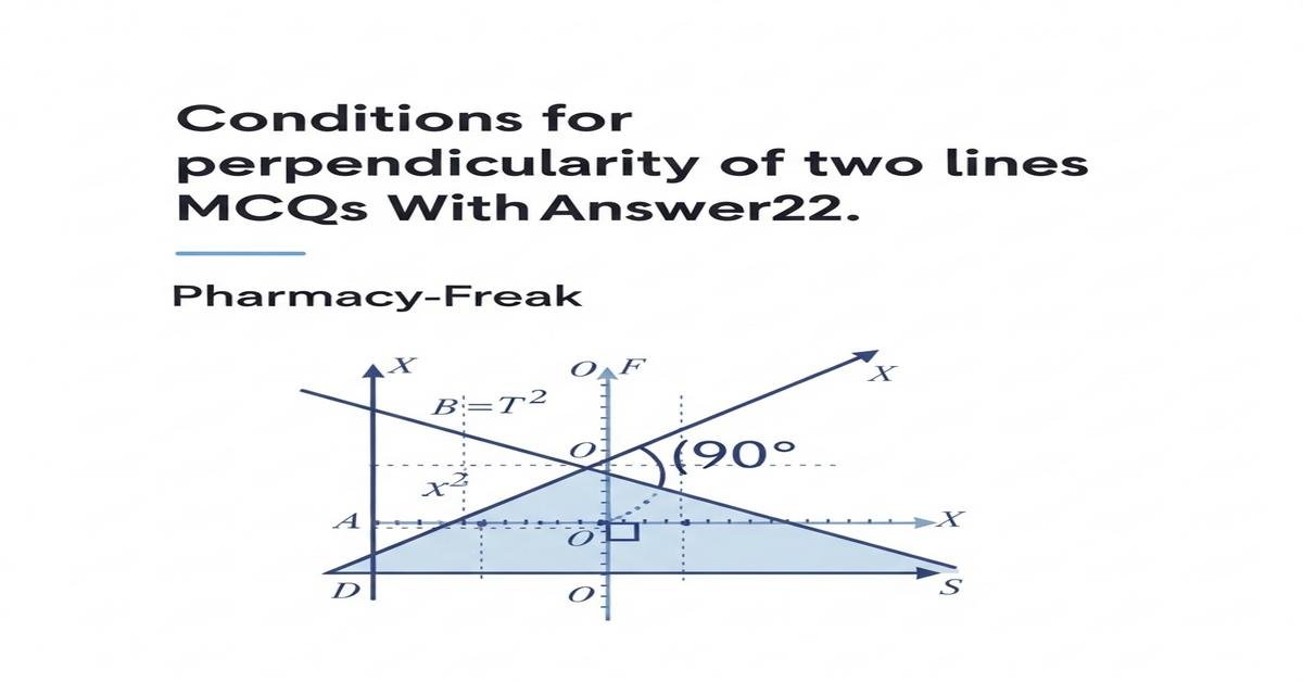 Introduction: Understanding the conditions for perpendicularity of two lines is essential for B. Pharm students who apply coordinate geometry and vector concepts in drug modeling, pharmacokinetics graphs, and instrumentation data analysis. This concise guide covers key ideas like slope product m1*m2 = -1, dot product of direction ratios equal to zero, conditions in general form ax+by+c=0, and extensions to 3D lines and planes. Clear definitions, representative examples, and focused terminology will help you master perpendicularity for exam MCQs and practical problem-solving. Now let’s test your knowledge with 50 MCQs on this topic.