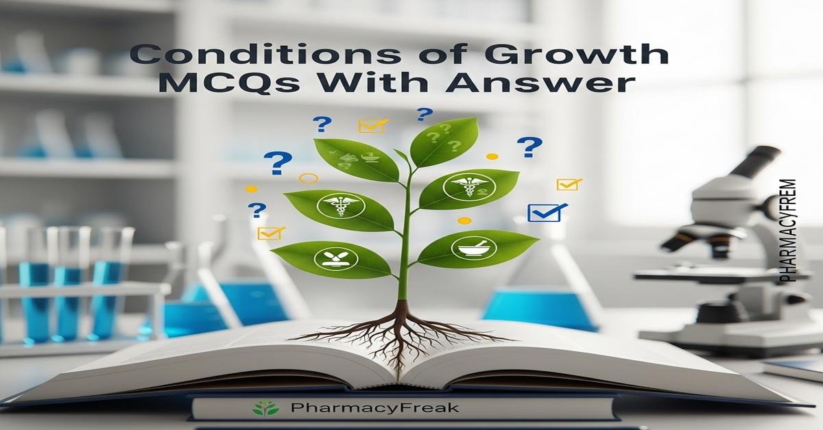 Conditions of growth MCQs With Answer are essential for B. Pharm students studying microbial behavior, sterilization and formulation stability. This concise guide covers microbial growth factors—temperature, pH, oxygen requirements, water activity, nutrients and growth phases—linking theory to practical lab conditions, culture media selection, and antimicrobial effects. You’ll review cardinal temperatures, lag/log/stationary/death phases, measurement techniques (CFU, OD), chemostat dynamics, and factors influencing biofilm and fastidious organism growth. Keywords: Conditions of growth MCQs With Answer, microbial growth conditions, B. Pharm students, culture conditions, growth factors, growth kinetics. Now let’s test your knowledge with 50 MCQs on this topic.