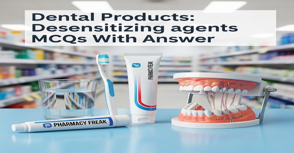 Introduction: Desensitizing agents are key dental products used to manage tooth sensitivity in clinical and over‑the‑counter formulations. This concise guide for B. Pharm students covers mechanisms such as the hydrodynamic theory, nerve desensitization by potassium salts, and tubule occlusion by fluorides, oxalates, calcium phosphates, glutaraldehyde, and lasers. It highlights formulations (toothpaste, varnish, gels), clinical application, stability, side effects like staining or mucosal irritation, and evidence-based selection. Understanding pharmacology, delivery systems, and patient factors helps pharmacists advise on effective, safe management of dentin hypersensitivity. Now let’s test your knowledge with 50 MCQs on this topic.