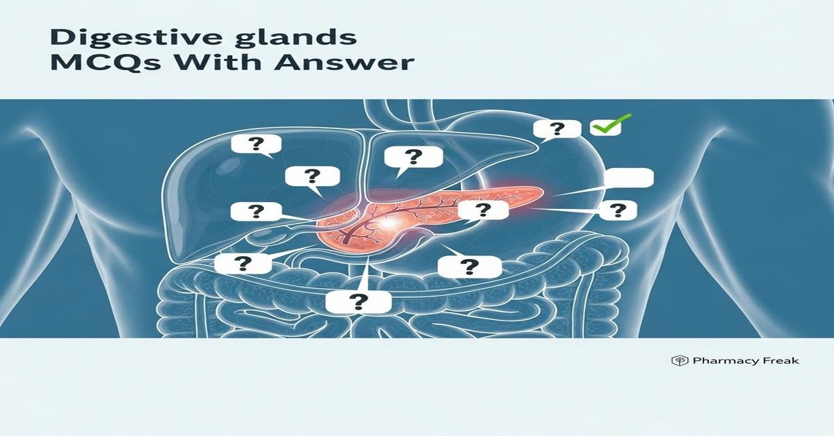 Digestive glands MCQs With Answer is a concise, exam-focused resource designed for B. Pharm students preparing for pharmacology, physiology, and pathology assessments. This collection covers salivary, gastric, pancreatic, hepatic and biliary glands, emphasizing secretions, enzymes, hormones (gastrin, CCK, secretin), zymogen activation, bile physiology, and drug interactions that alter gland function. Questions highlight clinical correlations—pancreatic insufficiency, cholestasis, enzyme inhibitors, and diagnostic markers—so you strengthen both basic science and therapeutic insights. Carefully crafted for concept clarity and rapid revision, these MCQs help improve recall, application and exam performance. Now let’s test your knowledge with 50 MCQs on this topic.