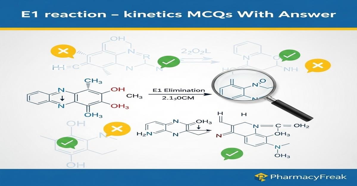 E1 reaction – kinetics MCQs With Answer is essential for B. Pharm students studying reaction mechanisms and pharmacokinetics of drug degradation and metabolism. This Student-friendly post explains E1 reaction kinetics, emphasizing unimolecular rate-determining ionization, carbocation formation, rate law (first order), solvent and leaving group effects, temperature influence, and common rearrangements. Understand how substrate structure (tertiary vs secondary), polar protic solvents, and weak bases favor E1 pathways. Mastery of these concepts helps predict elimination products, reaction rates, and competing SN1/E1 processes in medicinal chemistry and drug stability. Now let’s test your knowledge with 50 MCQs on this topic.