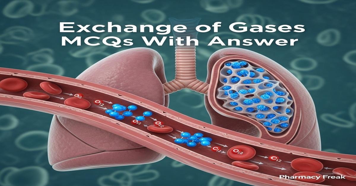 Exchange of gases MCQs With Answer – This compact, Student-friendly post helps B. Pharm students master respiratory physiology and clinical implications of gas exchange. Covering key topics such as alveolar ventilation, partial pressures, Fick’s law, oxygen and carbon dioxide transport, hemoglobin affinity, the oxygen dissociation curve, Bohr effect, 2,3-BPG, diffusion limitations, ventilation-perfusion mismatch, and pathological states (COPD, shunt, high altitude, CO poisoning), these MCQs reinforce pharmacology-relevant concepts and drug effects on gas transport. Clear explanations build understanding for exams and clinical practice. Focused keywords include gas exchange, respiratory physiology, oxygen transport, CO2 transport, hemoglobin, and Exchange of gases MCQs With Answer. Now let’s test your knowledge with 50 MCQs on this topic.