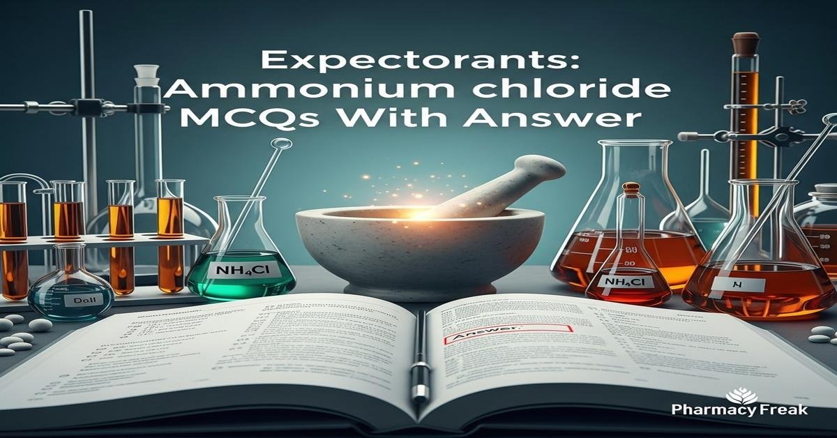 Ammonium chloride is a classic expectorant frequently discussed in B.Pharm pharmacology and formulation modules. This introduction covers its mechanism, chemical nature, clinical uses, pharmacokinetics, adverse effects, contraindications and formulation aspects — all key SEO terms for students: expectorants, ammonium chloride, B.Pharm, mechanism of action, dosage, adverse effects, urinary acidifier and respiratory therapy. Understanding how ammonium chloride increases bronchial secretions, causes urinary acidification and risks metabolic acidosis is essential for exams and practice. Clear grasp of interactions, quality control and patient counselling helps in both theory and pharmacy lab work. Now let’s test your knowledge with 50 MCQs on this topic.