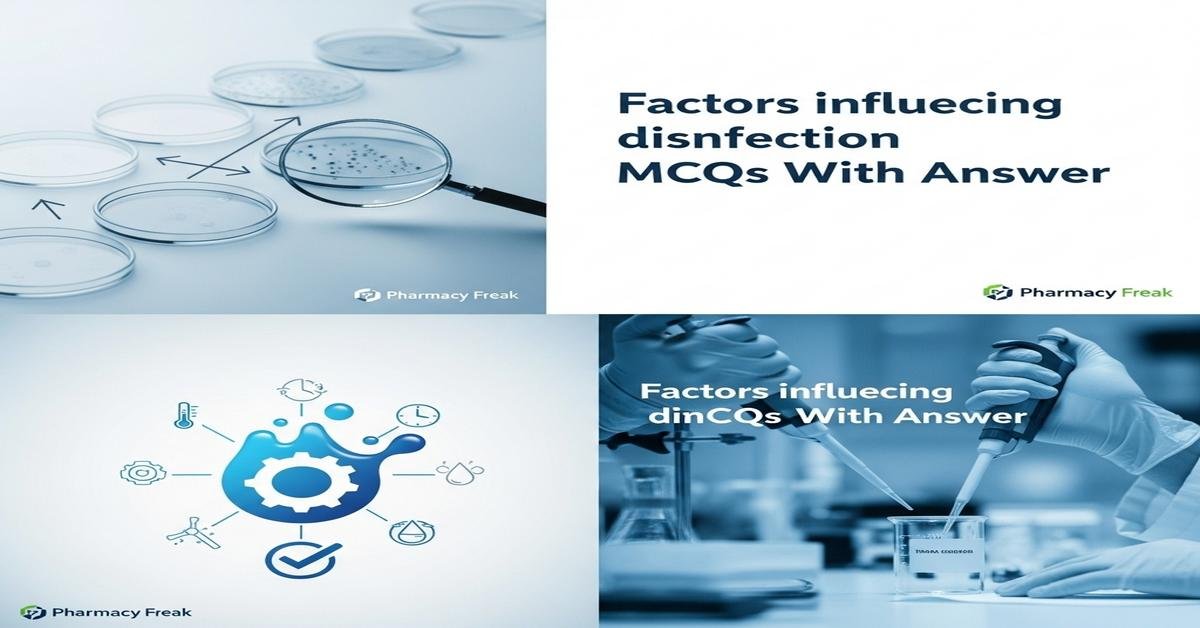 Factors influencing disinfection MCQs With Answer is a focused study resource for B. Pharm students covering critical variables that affect disinfectant efficacy. This introduction highlights key keywords like factors influencing disinfection, contact time, concentration, organic load, biofilms, temperature, pH, and disinfectant spectrum to boost pharmacy exam preparation and practical understanding. Learning how surface type, microbial load, disinfectant class (alcohols, chlorine, quaternary ammonium compounds, peroxygens, aldehydes), and operational factors alter outcomes is essential in pharmaceutical settings. Clear, evidence-based MCQs reinforce theory and lab application while improving infection control decisions. Now let’s test your knowledge with 50 MCQs on this topic.