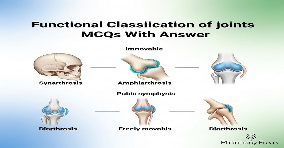Understanding the functional classification of joints is essential for B. Pharm students studying musculoskeletal physiology, drug delivery to joints, and therapy of joint disorders. This concise guide and quiz—Functional classification of joints MCQs With Answer—covers synarthrosis (immovable), amphiarthrosis (slightly movable) and diarthrosis/synovial (freely movable), synovial joint types, joint components like synovial membrane, articular cartilage and ligaments, and clinical-pharmacological aspects such as intra-articular drug administration and inflammation. Emphasis is placed on joint mobility, examples, biomechanics and implications for pharmacotherapy. Answers are provided to aid self-assessment and revision. Now let’s test your knowledge with 30 MCQs on this topic.