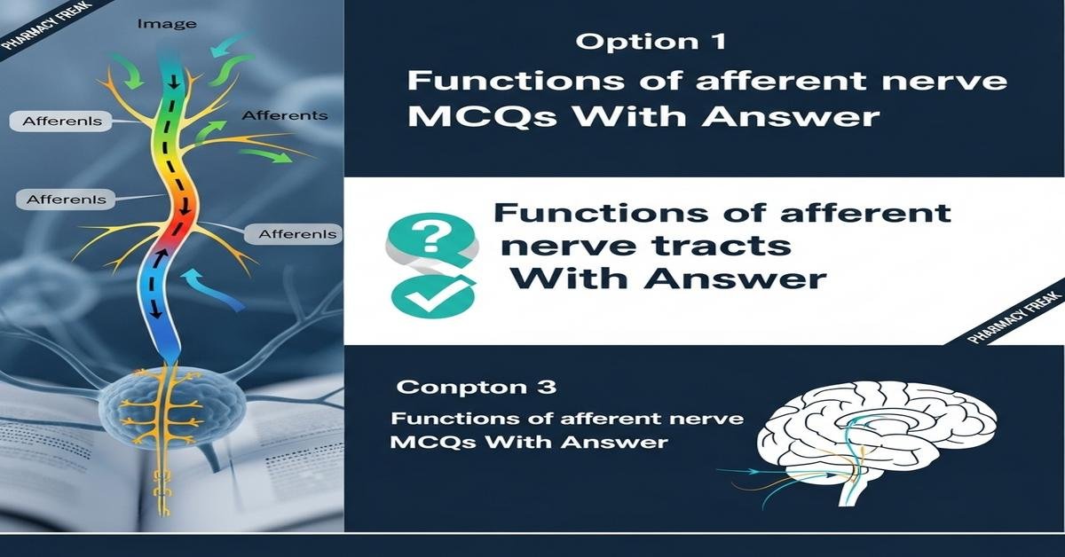 This concise introduction explains afferent nerve tracts for B. Pharm students, focusing on sensory pathways, physiological roles, and clinical relevance. Afferent tracts—dorsal column–medial lemniscus, spinothalamic, spinocerebellar and trigeminothalamic pathways—convey fine touch, vibration, proprioception, pain and temperature to higher centers. Understanding first-, second- and third-order neurons, decussation points, receptor types (e.g., mechanoreceptors, nociceptors) and neurotransmitters (glutamate, substance P) is essential for neuropharmacology and pain management. This topic links anatomy to drug actions (local anesthetics, opioids, gabapentinoids) and clinical signs (Brown-Séquard, sensory ataxia). Now let’s test your knowledge with 50 MCQs on this topic.