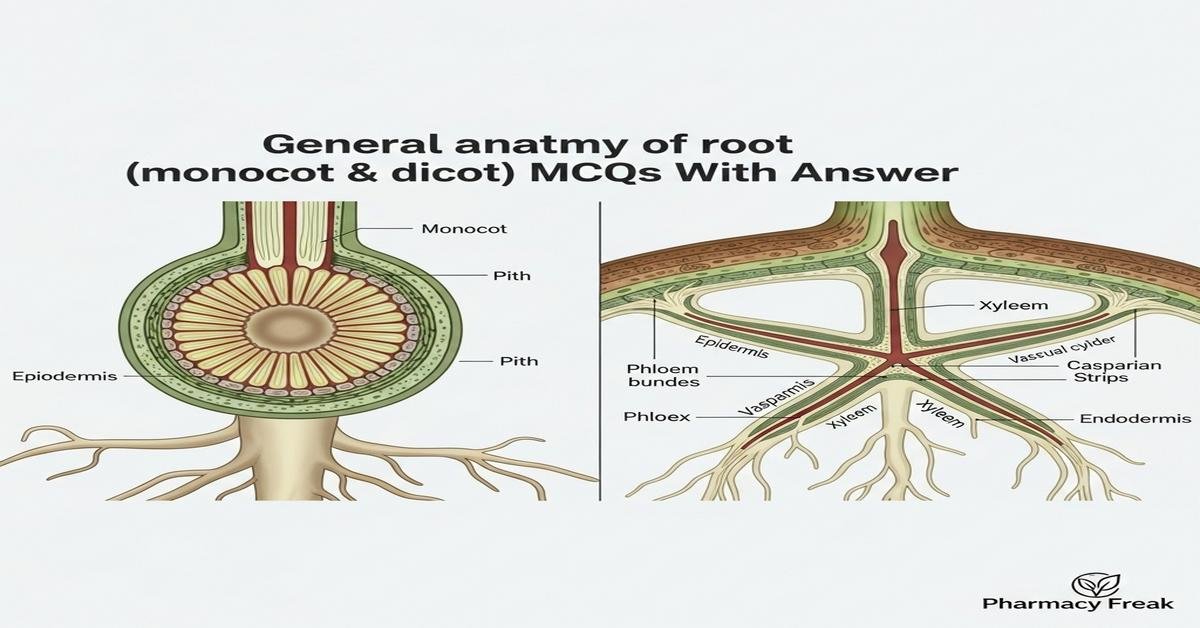 Introduction: Understanding the general anatomy of root (monocot & dicot) is essential for B.Pharm students studying plant-based drugs, extraction sources, and pharmacognosy. This concise guide covers root histology, root cap, apical meristem, cortex, endodermis with Casparian strip, pericycle, vascular cylinder, xylem-phloem arrangement, and differences between monocot root and dicot root including secondary growth and presence of pith. Emphasis on functional anatomy—root hairs, lateral root origin, and modifications for storage or aeration—helps link structure to pharmacological relevance. Clear, exam-oriented MCQs reinforce concepts and clinical plant identification skills. Now let’s test your knowledge with 50 MCQs on this topic.