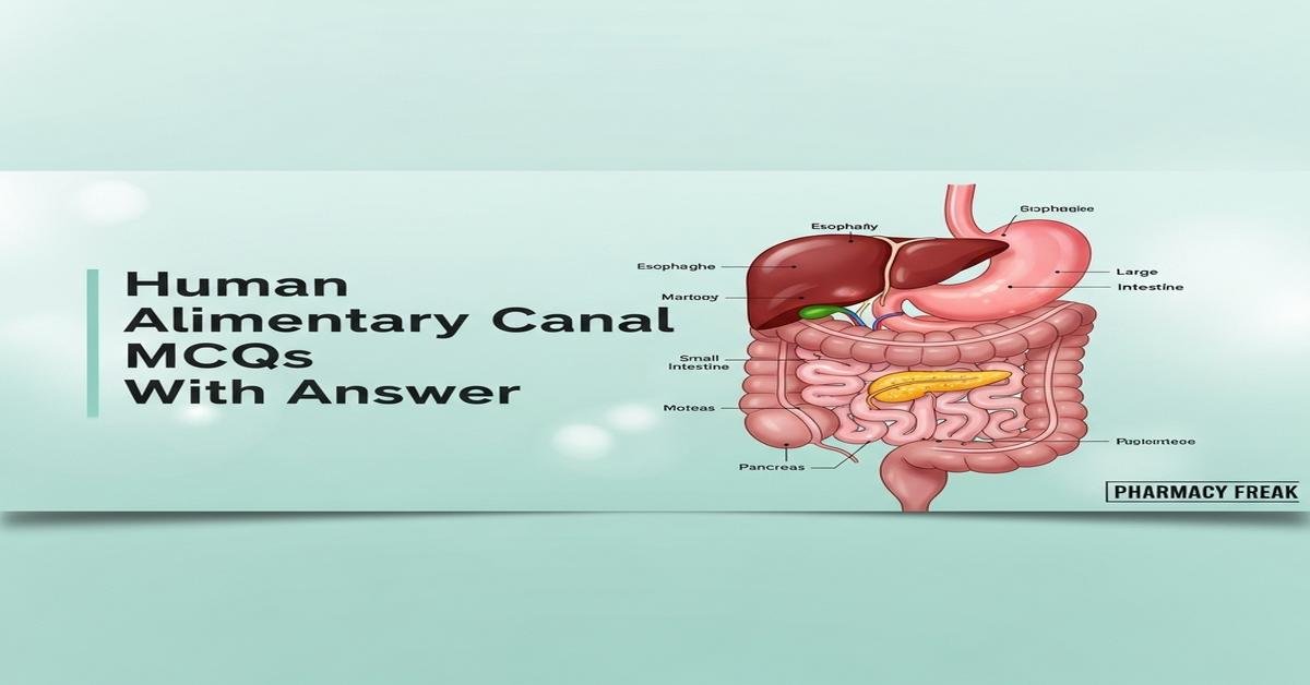 Introduction: Mastering the human alimentary canal is essential for B. Pharm students preparing for therapeutics, pharmacokinetics and pathophysiology exams. This concise introduction and comprehensive Human alimentary canal MCQs With Answer collection covers anatomy, histology, enzymatic digestion, absorption, motility, secretions, gut hormones, hepatic and biliary functions, microbiota and clinical correlations relevant to drug action and delivery. Questions emphasize mechanisms—enzyme specificity, pH effects on absorption, enterohepatic recycling, first‑pass metabolism—and practical implications for oral drug formulation, interactions and disease states like peptic ulcers, malabsorption and cholera. Each MCQ is targeted to reinforce core concepts and exam readiness. Now let’s test your knowledge with 50 MCQs on this topic.