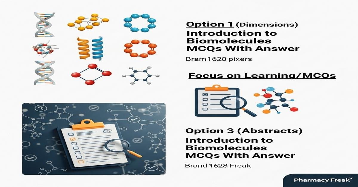 Introduction to biomolecules MCQs With Answer is a focused study tool for B. Pharm students preparing for pharmacology, biochemistry and pharmacy exams. Covering essential biomolecules — carbohydrates, proteins, lipids, nucleic acids, amino acids, vitamins and enzymes — the MCQs emphasize structure, function, bonding, metabolism and clinical relevance. Each question is paired with precise answers to reinforce concepts like peptide and glycosidic bonds, stereochemistry, isoelectric point, fatty acid saturation, nucleotide composition and enzyme kinetics. Ideal for quick revision, self-assessment and classroom practice, this resource helps build conceptual clarity and exam confidence. Now let’s test your knowledge with 50 MCQs on this topic.