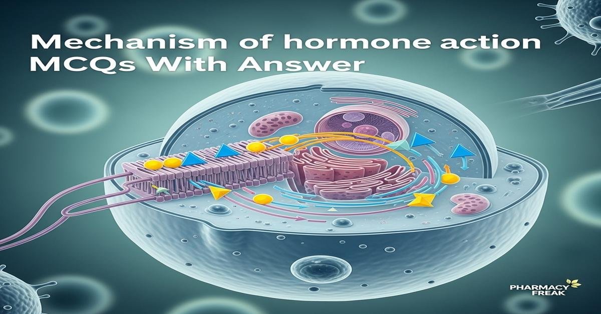 Mechanism of hormone action MCQs With Answer is an essential resource for B. Pharm students preparing for pharmacology and endocrine modules. This concise, Student-friendly post covers receptor types, signal transduction pathways, second messengers (cAMP, IP3/DAG, cGMP), nuclear receptor genomics, receptor regulation, and pharmacological modulation of hormone action. Focused keywords such as mechanism of hormone action, hormone receptors, signal transduction, second messengers, endocrine pharmacology, and MCQs help improve search visibility and study relevance. Each MCQ probes core concepts and clinical correlations to deepen understanding and exam readiness. Now let’s test your knowledge with 50 MCQs on this topic.