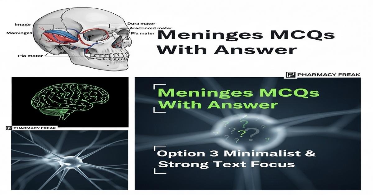 Meninges MCQs With Answer — a focused, Student-friendly post tailored for B. Pharm learners. The meninges (dura mater, arachnoid mater, and pia mater) protect the central nervous system, regulate cerebrospinal fluid (CSF) flow, and influence drug distribution to the brain and spinal cord. Understanding their anatomy, physiology, vascular supply, innervation, and clinical correlations (meningitis, hematomas, lumbar puncture) is essential for pharmacists when considering CNS drug delivery, CSF interpretation, and patient care. This concise set of targeted, clinically relevant questions reinforces core concepts and pharmacological implications. Now let’s test your knowledge with 50 MCQs on this topic.