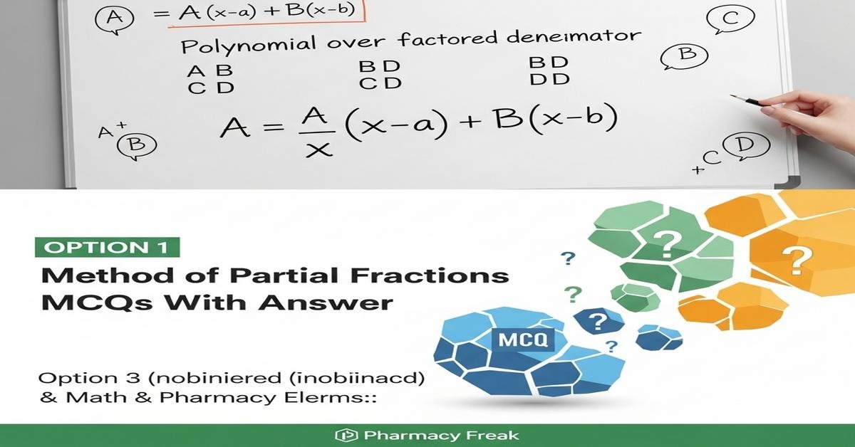 Method of Partial fractions MCQs With Answer is essential for B. Pharm students who apply algebra to pharmacokinetics, drug formulation and analytical calculations. This concise introduction explains how partial fraction decomposition breaks complex rational expressions into simpler terms for integration, inverse Laplace transforms and solving compartment models. You will learn when to use polynomial division, handle repeated linear or irreducible quadratic factors, and apply the Heaviside cover-up or coefficient-comparison methods. These skills strengthen calculations in drug release kinetics and PK/PD modeling. The following MCQs reinforce theory and step-by-step problem solving for practical pharmacy applications. Now let’s test your knowledge with 50 MCQs on this topic.
