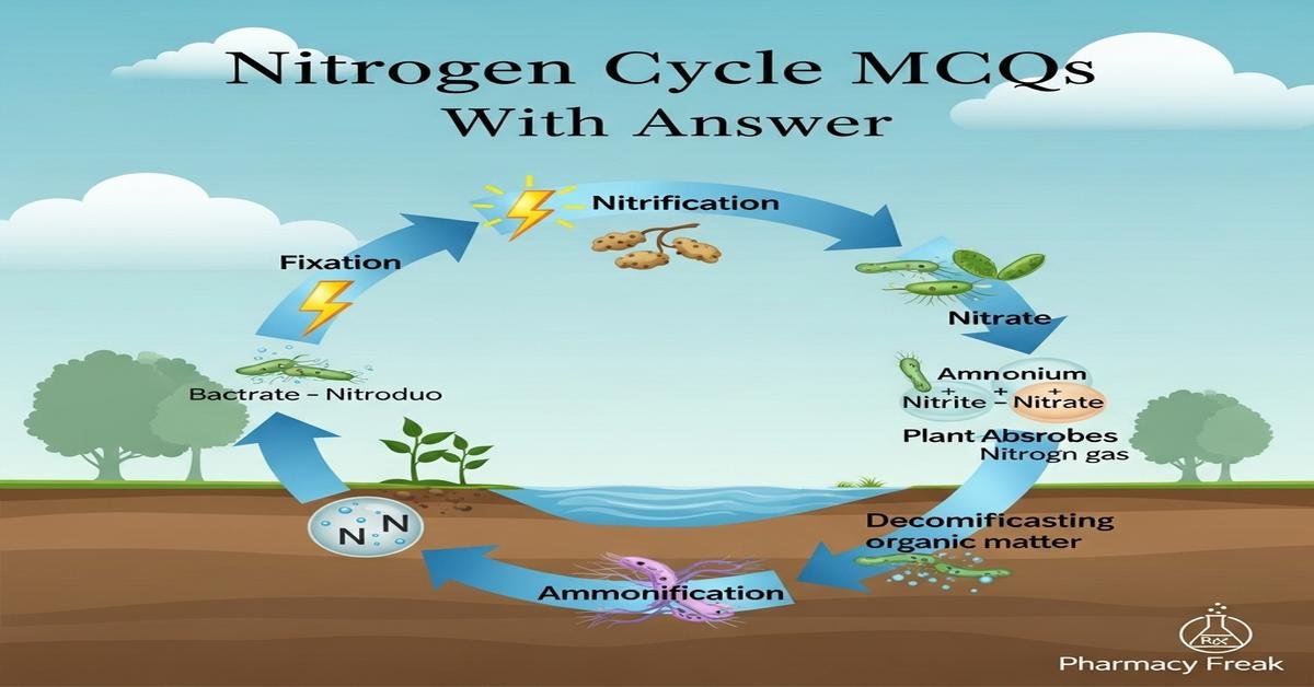 Understanding the nitrogen cycle is essential for B. Pharm students, especially when studying drug biosynthesis, microbial metabolism, and environmental pharmacology. This concise guide on Nitrogen cycle MCQs With Answer covers core processes—nitrogen fixation, ammonification, nitrification, denitrification, assimilation—and key players like Rhizobium, Nitrosomonas, Nitrobacter, and denitrifiers. Learn about enzymes (nitrogenase, nitrate reductase), chemical forms (NH3, NH4+, NO2−, NO3−), industrial fixation, and clinical/environmental impacts such as nitrate toxicity and eutrophication. These focused questions deepen mechanistic understanding and link biochemical pathways to pharmaceutical and environmental applications. Now let’s test your knowledge with 50 MCQs on this topic.