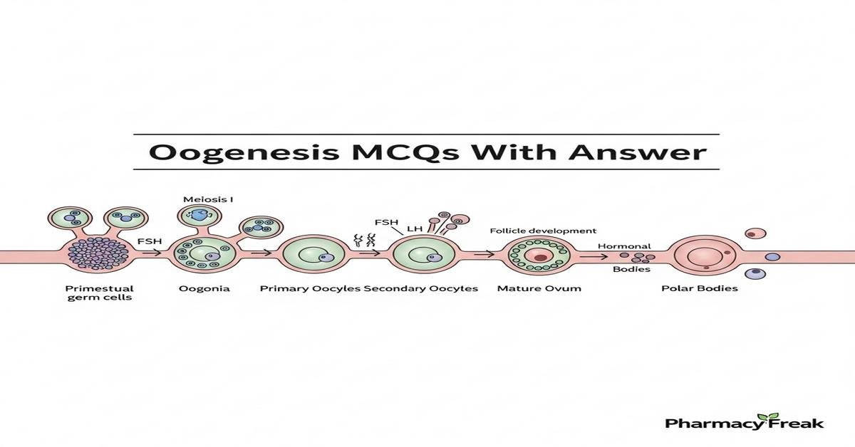 Oogenesis MCQs With Answer provides B. Pharm students a focused, exam-ready review of female gametogenesis, folliculogenesis and oocyte maturation. This concise introduction covers key concepts—meiotic arrest, hormonal regulation by FSH/LH, roles of granulosa cells, cortical granules, zona pellucida proteins, and molecular regulators like MPF, cAMP, GDF9/BMP15—presented in clear, high-yield MCQs. Ideal for pharmacology, reproductive biology and clinical pharmacy revisions, these questions emphasize mechanisms, clinical correlations (IVF, aneuploidy, ovarian reserve) and drug influences on oocyte quality. Each MCQ includes the correct answer to reinforce learning and retention. Now let’s test your knowledge with 50 MCQs on this topic.