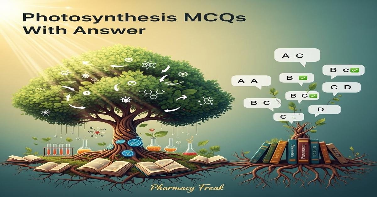 Photosynthesis MCQs With Answer: A focused study tool for B. Pharm students aiming to master plant bioenergetics, chlorophyll chemistry, and photochemical pathways. These targeted multiple-choice questions cover light-dependent reactions, the Calvin cycle, electron transport chains, ATP/NADPH synthesis, photophosphorylation, RuBisCO kinetics, C3/C4/CAM differences, and herbicide modes of action. Each item emphasizes biochemical mechanisms, chloroplast ultrastructure, pigment interactions, and pharmacologically relevant inhibitors of photosynthesis. Ideal for exam preparation, active revision, and improving problem-solving skills, this set reinforces core concepts vital to pharmaceutical sciences and research applications. Now let’s test your knowledge with 50 MCQs on this topic.
