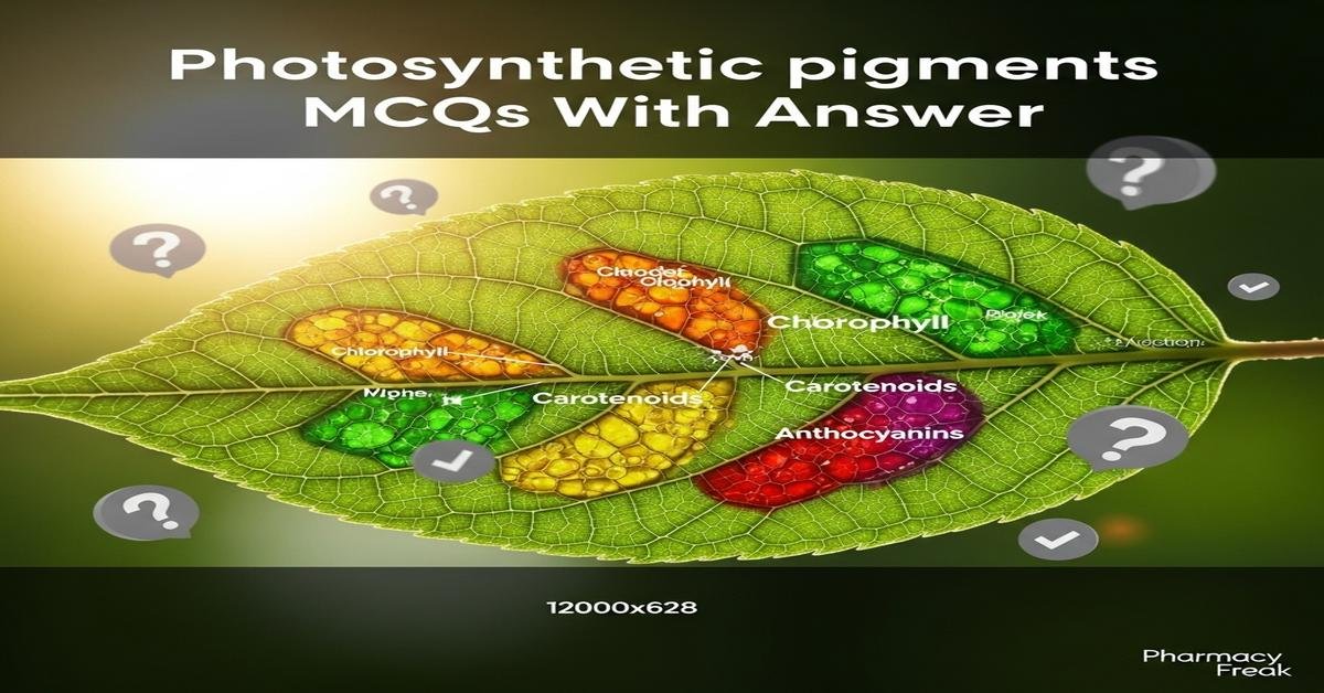 Photosynthetic pigments MCQs With Answer is a focused study resource designed for B. Pharm students preparing for pharmacognosy and phytochemistry exams. This concise, Student-friendly post covers chlorophylls, carotenoids, xanthophylls, bacteriochlorophylls, their structures, absorption spectra, extraction methods, degradation products and analytical techniques like spectrophotometry, TLC and HPLC. Understanding these pigments is essential for herbal drug standardization, stability studies and quality control of plant-derived medicines. Questions emphasize biochemical roles, photoprotection, pigment–protein complexes and practical laboratory identification. Clear explanations and targeted MCQs help reinforce key concepts and exam readiness. Now let’s test your knowledge with 50 MCQs on this topic.