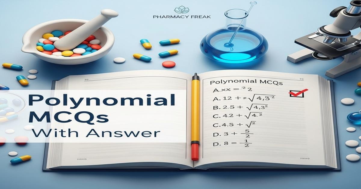 Polynomial MCQs With Answer tailored for B. Pharm students help bridge algebraic foundations and pharmacy applications. This concise, exam-focused resource covers polynomial definitions, degrees, zeros, factor and remainder theorems, Vieta’s relations, synthetic division, and solving polynomial equations relevant to pharmaceutics and pharmacokinetics. Questions emphasize practical uses such as modeling drug-release kinetics, formulation calculations, and data fitting, while reinforcing problem-solving skills required in calculus and pharmaceutical mathematics. Each multiple-choice item includes clear options and explanations to boost accuracy, speed and conceptual depth. Now let’s test your knowledge with 50 MCQs on this topic.
