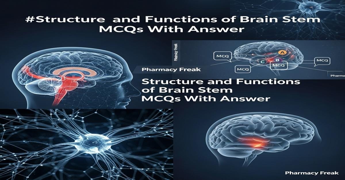 The brain stem — composed of the midbrain, pons and medulla oblongata — controls vital functions such as respiration, cardiovascular regulation, cranial nerve reflexes and arousal. For B.Pharm students, mastering the structure and functions of brain stem is essential for understanding drug effects on respiratory centers, autonomic pathways, cranial nerve pharmacology and clinical syndromes like locked‑in state or Wallenberg infarct. These MCQs focus on anatomy, nuclei, ascending/descending tracts, blood supply and pharmacological relevance, with clinical correlations to improve diagnostic and therapeutic insight. Clear, targeted practice of these topics will strengthen exam readiness and practical pharmacology knowledge. Now let’s test your knowledge with 50 MCQs on this topic.