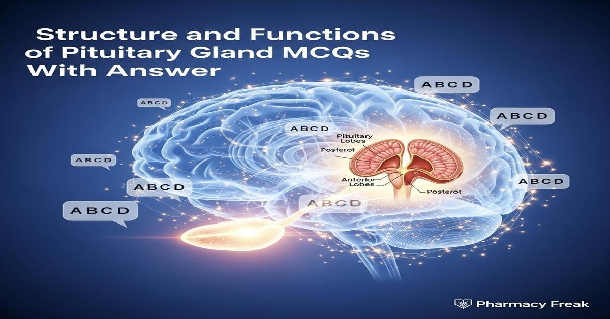 Structure and functions of pituitary gland MCQs With Answer — The pituitary gland, a small but vital endocrine organ at the base of the brain, integrates hypothalamic signals and secretes hormones that regulate growth, metabolism, reproduction and fluid balance. B. Pharm students should grasp anterior (adenohypophysis) and posterior (neurohypophysis) anatomy, cell types, hypothalamo‑hypophyseal portal circulation, hormone synthesis (GH, ACTH, TSH, PRL, LH, FSH, ADH, oxytocin) and pharmacological modulators. Clinical correlations — acromegaly, Cushing’s disease, prolactinoma, diabetes insipidus — and drug actions (dopamine agonists, somatostatin analogs, desmopressin) are essential for practice. Now let’s test your knowledge with 50 MCQs on this topic.