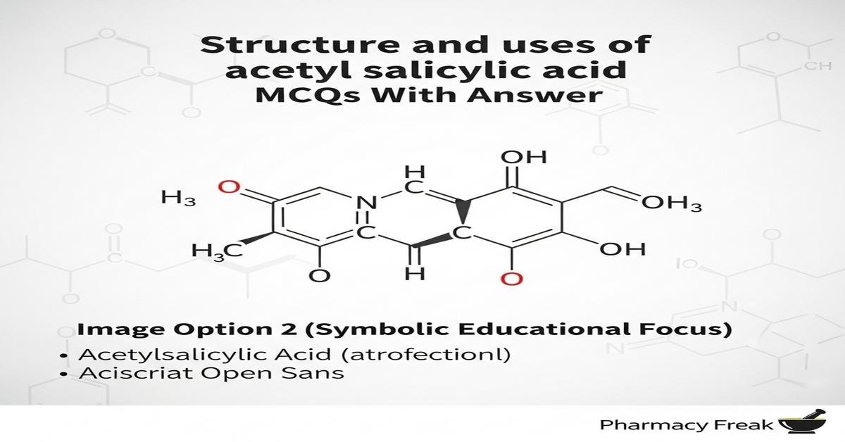 Acetyl salicylic acid (aspirin) is a cornerstone NSAID studied extensively in B. Pharm curricula for its chemical structure, synthesis, pharmacology, and clinical uses. Understanding its 2-(acetyloxy)benzoic acid structure—featuring an esterified phenolic hydroxyl and a free carboxyl group—explains stability, hydrolysis, and reactivity. Key pharmaceutical topics include mechanism of action (irreversible COX acetylation), pharmacokinetics, dosage forms (enteric-coated, tablets), common therapeutic uses (analgesic, antipyretic, anti-inflammatory, antiplatelet), side effects and drug interactions, and analytical assay methods. These MCQs focus on deeper conceptual and practical aspects relevant to B. Pharm students. Now let’s test your knowledge with 50 MCQs on this topic.