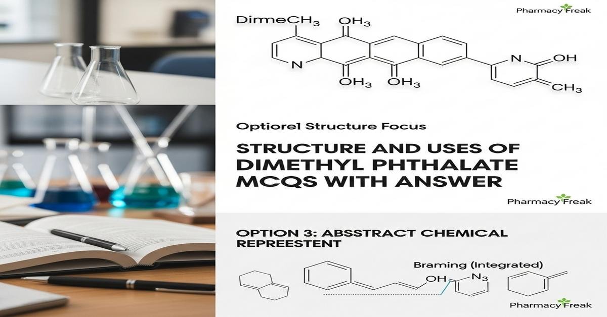Dimethyl phthalate (DMP) is a low-molecular-weight phthalate ester important in pharmaceutical science as a plasticizer, solvent and preservative adjunct. B.Pharm students must grasp its chemical structure (phthalate core with two methyl ester groups), synthesis from phthalic anhydride and methanol, physicochemical properties (boiling point, solubility, log P), analytical identification (IR, NMR, GC–MS), pharmaceutical applications, toxicology, metabolism and environmental fate. Emphasis on formulation compatibility, leaching risks, hydrolysis, ester interchange, biodegradation pathways, occupational exposure limits and regulatory aspects prepares students for formulation development and quality control. Understanding these concepts aids safe handling, proper analysis and critical appraisal of DMP-containing products. Now let’s test your knowledge with 50 MCQs on this topic.