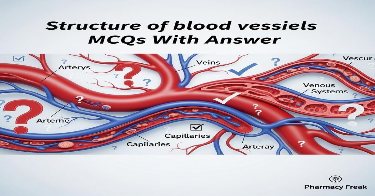 Structure of blood vessels MCQs With Answer is a focused study resource tailored for B. Pharm students to master vascular anatomy, histology, and pharmacological relevance. This introduction covers key concepts such as layers of blood vessels (tunica intima, media, adventitia), types of vessels (elastic, muscular arteries, arterioles, veins, capillaries), endothelial functions, vasa vasorum, and capillary types. Emphasis is placed on how structural features influence blood flow, compliance, permeability, and responses to vasoactive drugs like nitrates, calcium channel blockers, and ACE inhibitors. Clear, keyword-rich content supports exam preparation and clinical understanding. Now let’s test your knowledge with 50 MCQs on this topic.
