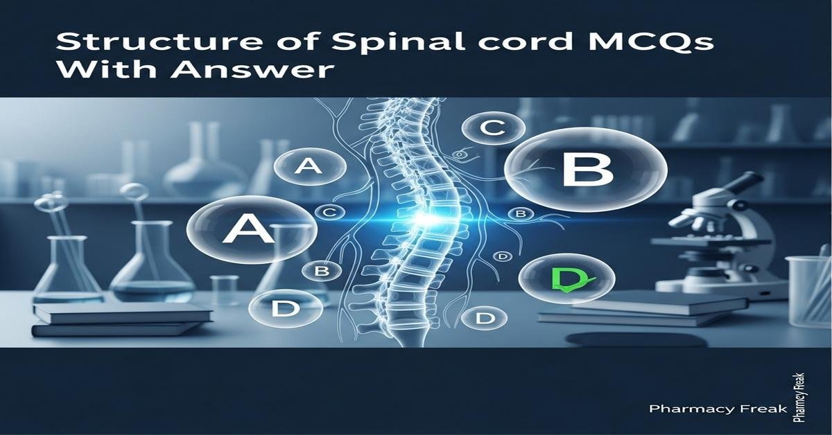 Study of the Structure of Spinal Cord MCQs With Answer is essential for B. Pharm students to master spinal neuroanatomy and its clinical correlations. This concise, exam-focused guide covers spinal segments, cervical and lumbar enlargements, gray and white matter organization, dorsal and ventral horns, central canal, meninges, roots and plexuses, Rexed laminae, ascending and descending tracts, and blood supply. Emphasis on functional anatomy, reflex arcs, and pathological implications helps pharmacy students understand drug targets, regional anesthesia, and neurological signs. Practice with targeted MCQs reinforces retention, clinical reasoning, and pharmacological relevance in patient care. Now let’s test your knowledge with 50 MCQs on this topic.
